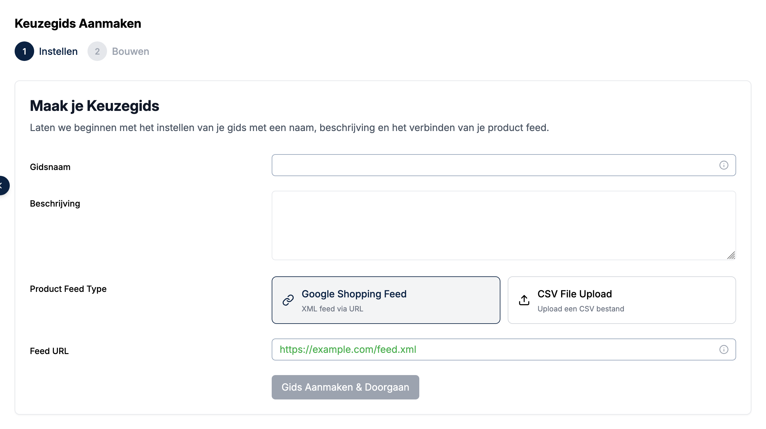 Om aan de slag te gaan met onze keuzegids tool, dien je eerst je shopping feed te koppelen. Wij ondersteunen rechtstreekse import en synchronisatie van Google Shoppingfeeds alsmede de import van CSV bestanden.