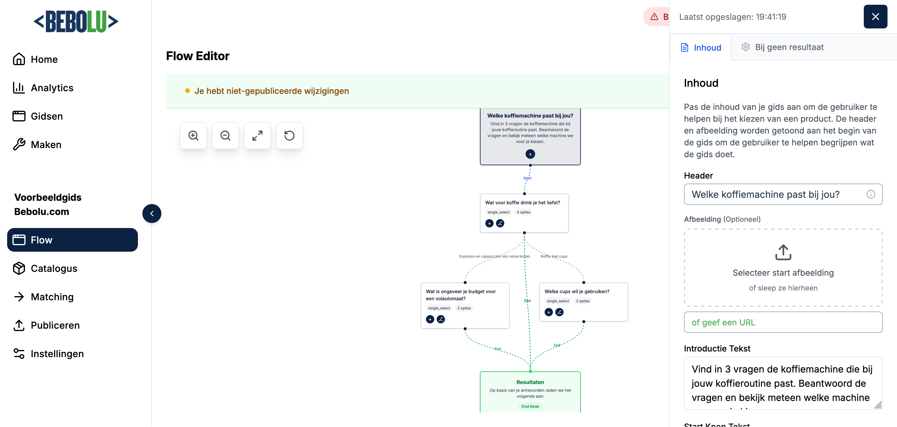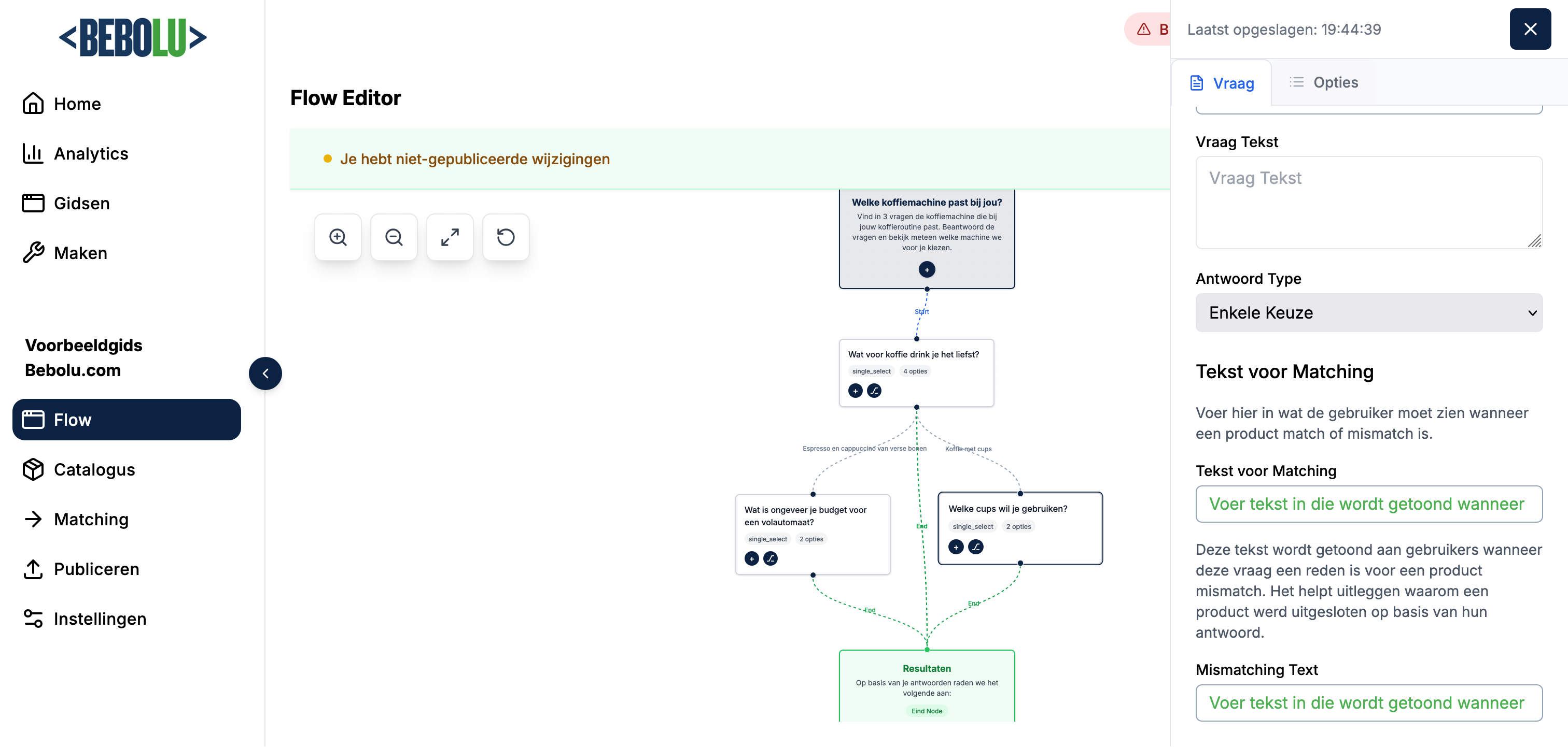 Iedere antwoordoptie kan in principe worden gekoppeld aan een andere (volgende) vraag. Je keuzegids wordt in eerste instantie als draft opgeslagen, zodat je wijzigingen niet direct live gaan. Wanneer je klaar bent om je nieuwe versie op te slaan, klik je eenvoudigweg op publiceren.