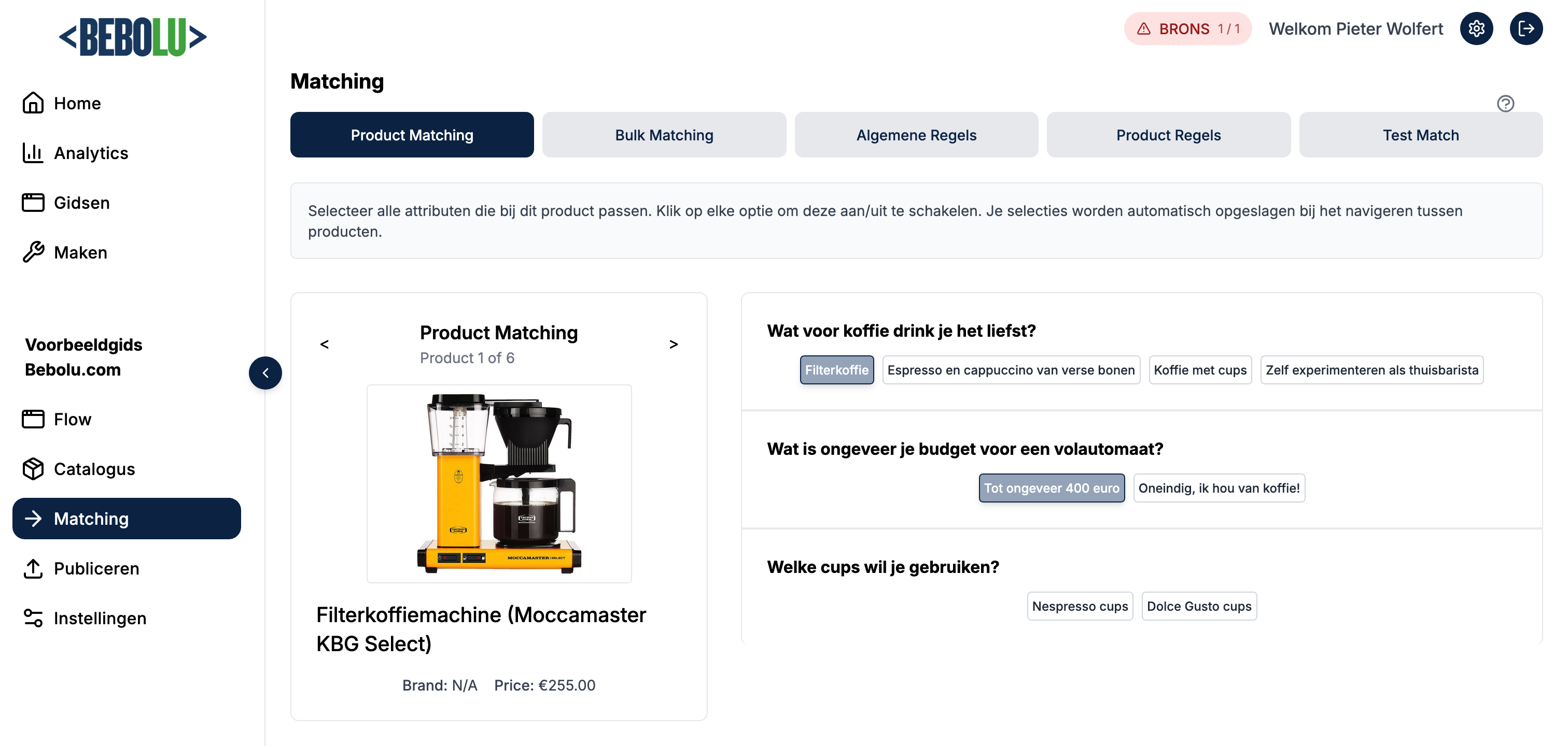 Na het aanmaken en publiceren van je flow (zodat deze kan worden weergegeven), moet je producten gaan matchen aan de vragen in je flow.