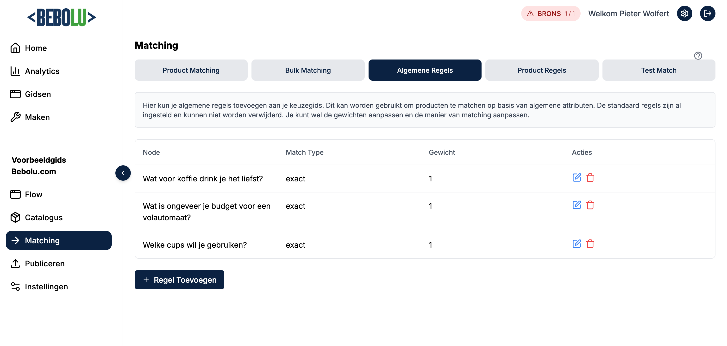 Zodra je begint met matchen worden er algemene regels aangemaakt. Deze hebben standaard gewicht 1. Deze regels blijven altijd staan, maar je kunt de manier van matchen (exact of range) en het gewicht aanpassen. Op deze manier kun je bijv. zwembadpompen koppelen aan een inhoud range.