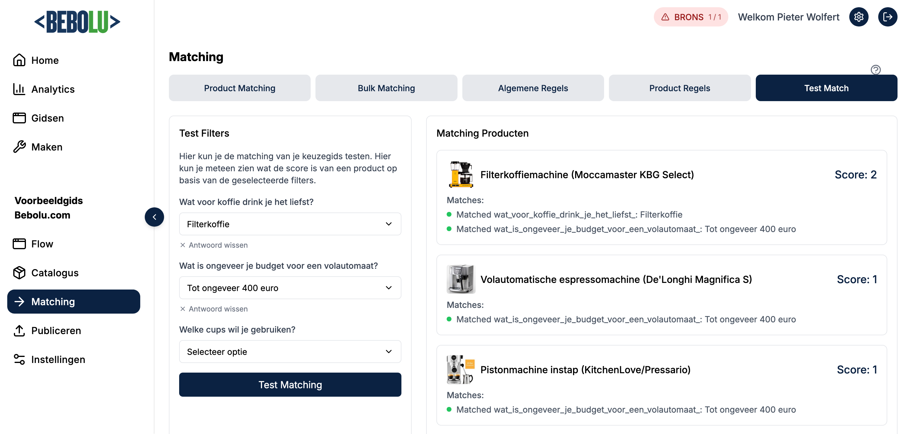Onder het tabblad test match kun je jouw keuzegids en de ingestelde regels testen. We geven standaard 3 opties terug richting de klant: we willen keuzestress immers verminderen!